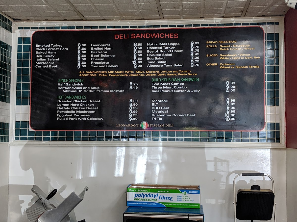 The menu at Leonardo's Deli Cafe offers a selection of sandwiches, deli-style items, and Italian-inspired dishes suitable for breakfast, lunch, or a casual meal. Visitors can find a range of sandwiches featuring various fillings such as turkey, mortadella, tri-tip, chicken, and tuna, served on different types of bread including ciabatta and sourdough. The sandwich options also include paninis and hoagies, catering to different preferences.